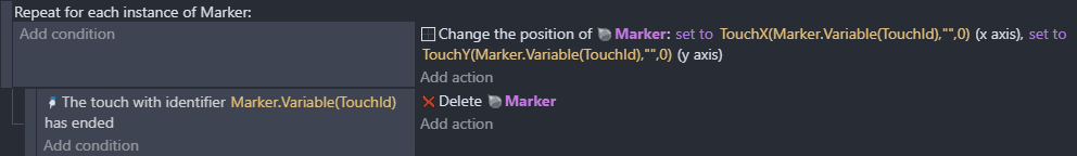 • When the touch moves, the touch identifier is needed to make sure to follow the right touch. A variable can be used to ensure this.