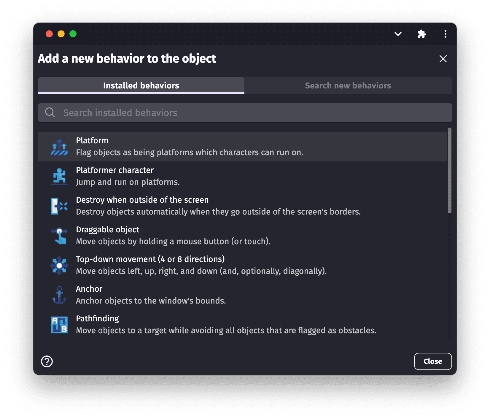 By selecting the "Platformer character" behavior, you can turn an object into a "Platformer character".