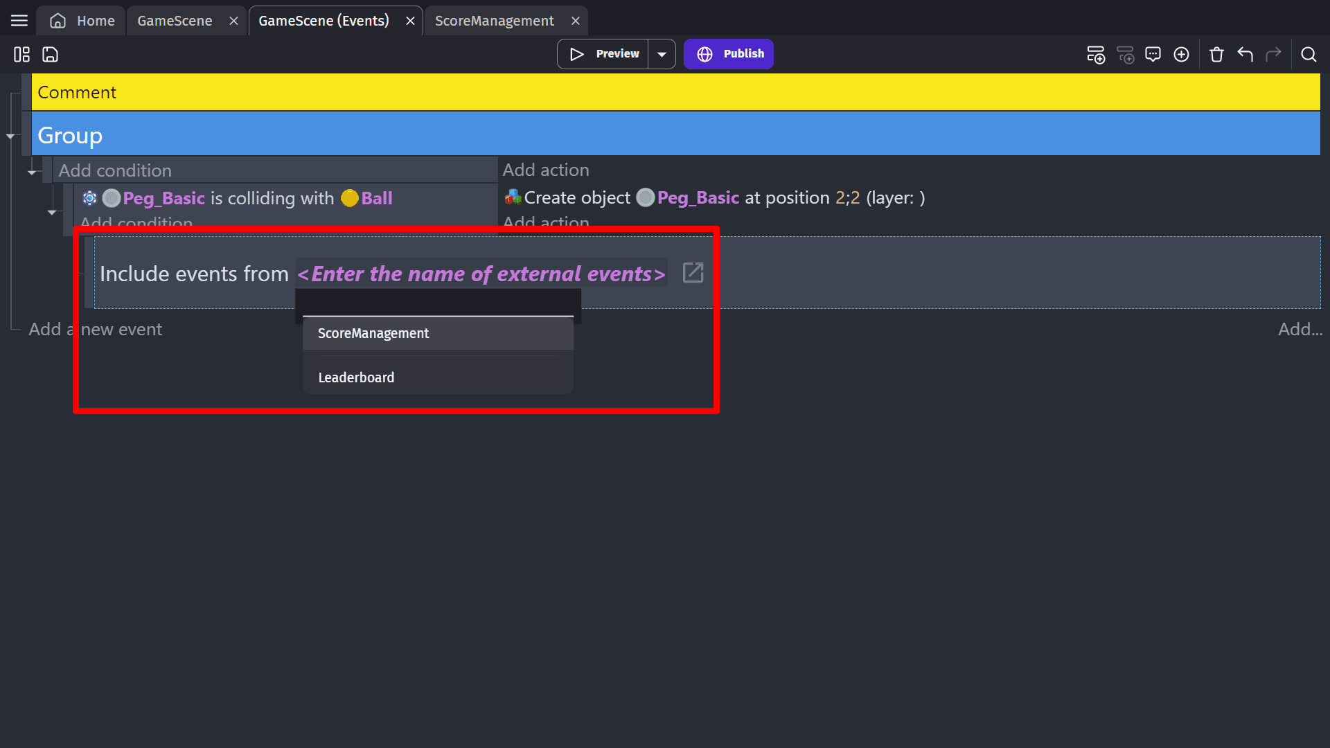 Link events are event blocks that link logic from external events or other scenes in your game to the event sheet they're placed in. Links indicate to GDevelop that events must be inserted at the position of the Link. These events can come from another scene in the game or from external events.