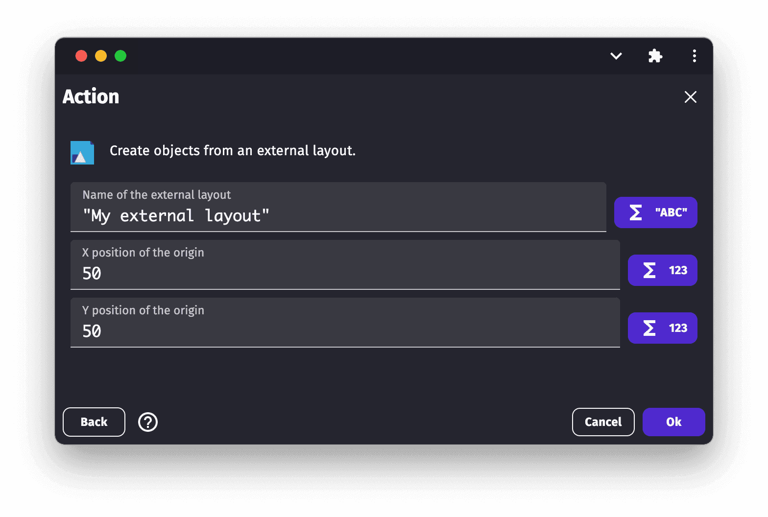 An external layout can be used to create a layout of objects, in the same way you would in a scene editor. Objects in an external layout can then be dynamically loaded into a scene using the action Create objects from an external layout.