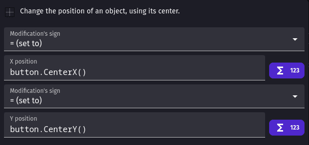 The process for aligning text to other objects is similar. Consider placing a text object on a button. Use the Center position action with X and Y values OBJECT.CenterX() and OBJECT.CenterY() respectively to position the center of your text object over the center of your button object.