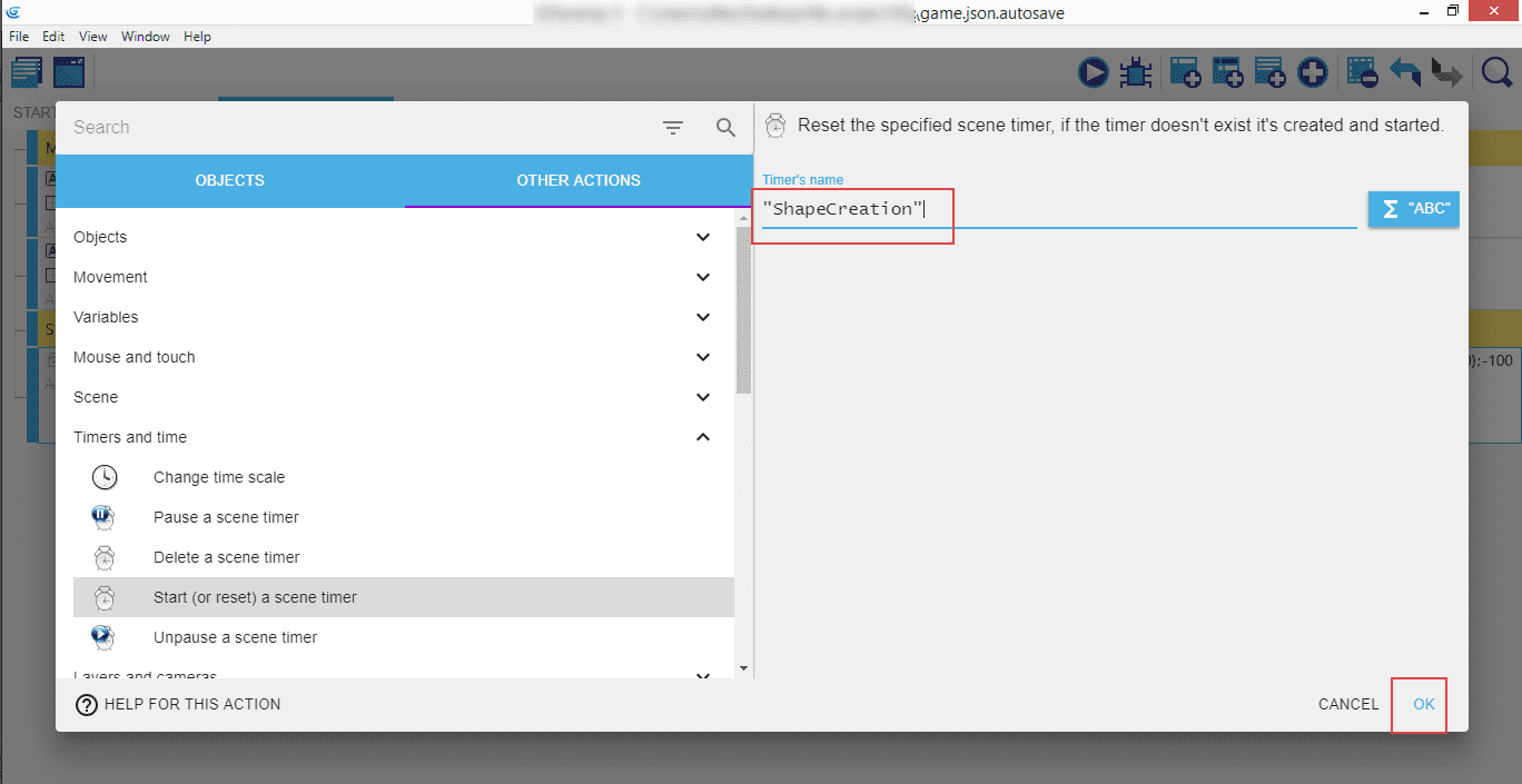 Second is the "Timer's name" - set that to "ShapeCreation", and click "Ok" when you finished entering both values.