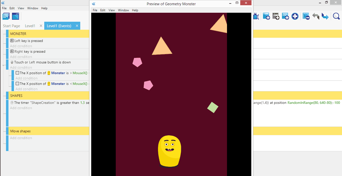 Launch the game to see all that in action - shapes should fall down the scene. It feels like something is missing, right? They go through the Monster, so we need to introduce collision detection to be able to collect them.