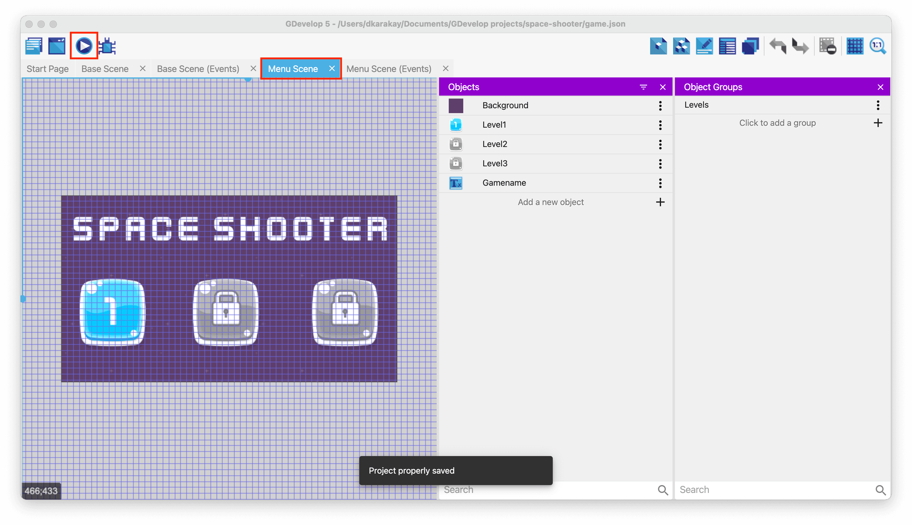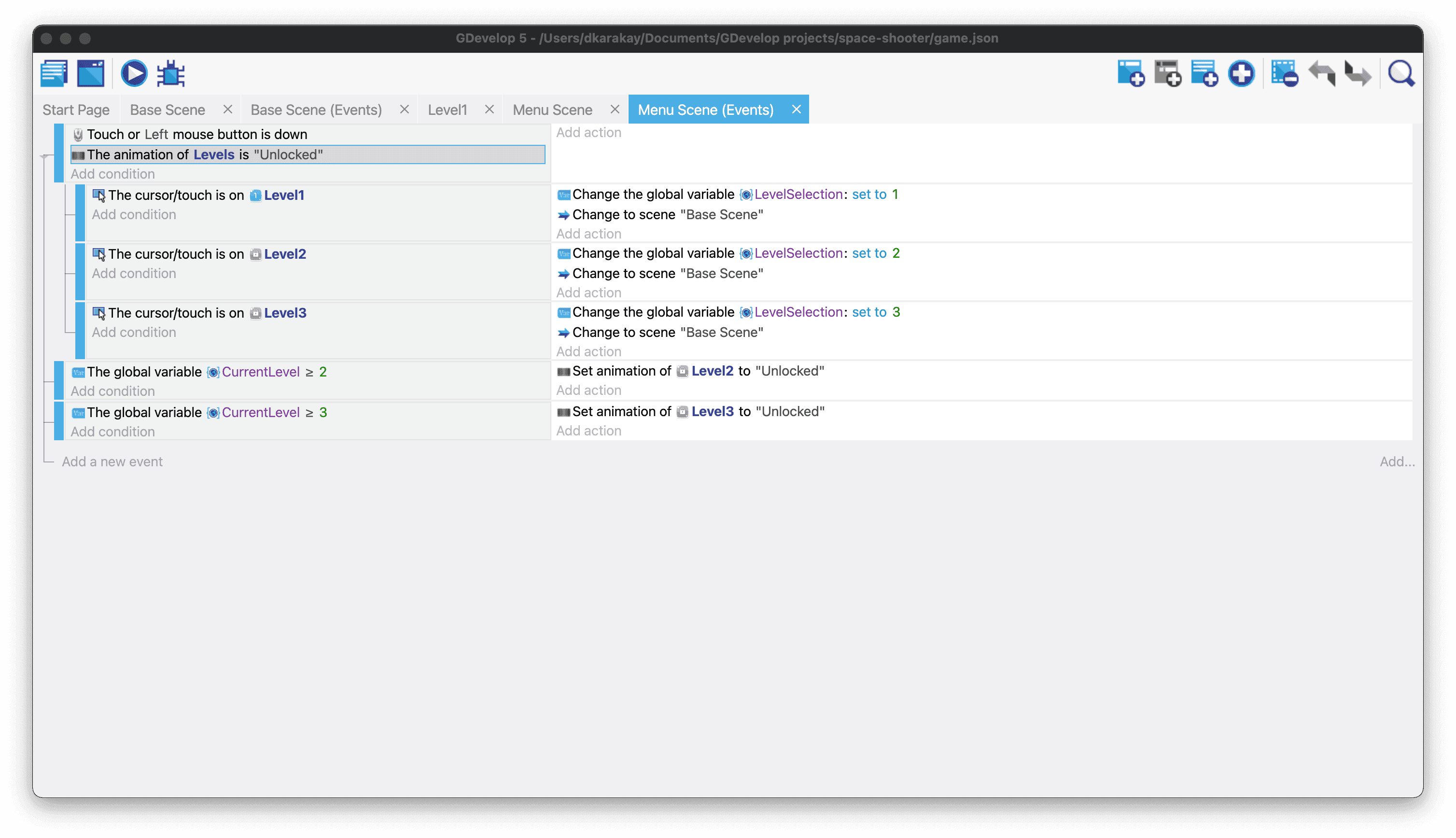 Create a new global variable called "LevelSelection" and set its initial value to 1. Then, change this variable to open the specific level (e.g., change it to 2 to load Level 2). Then add an action to run Base Scene. In the end, your events should look like this: