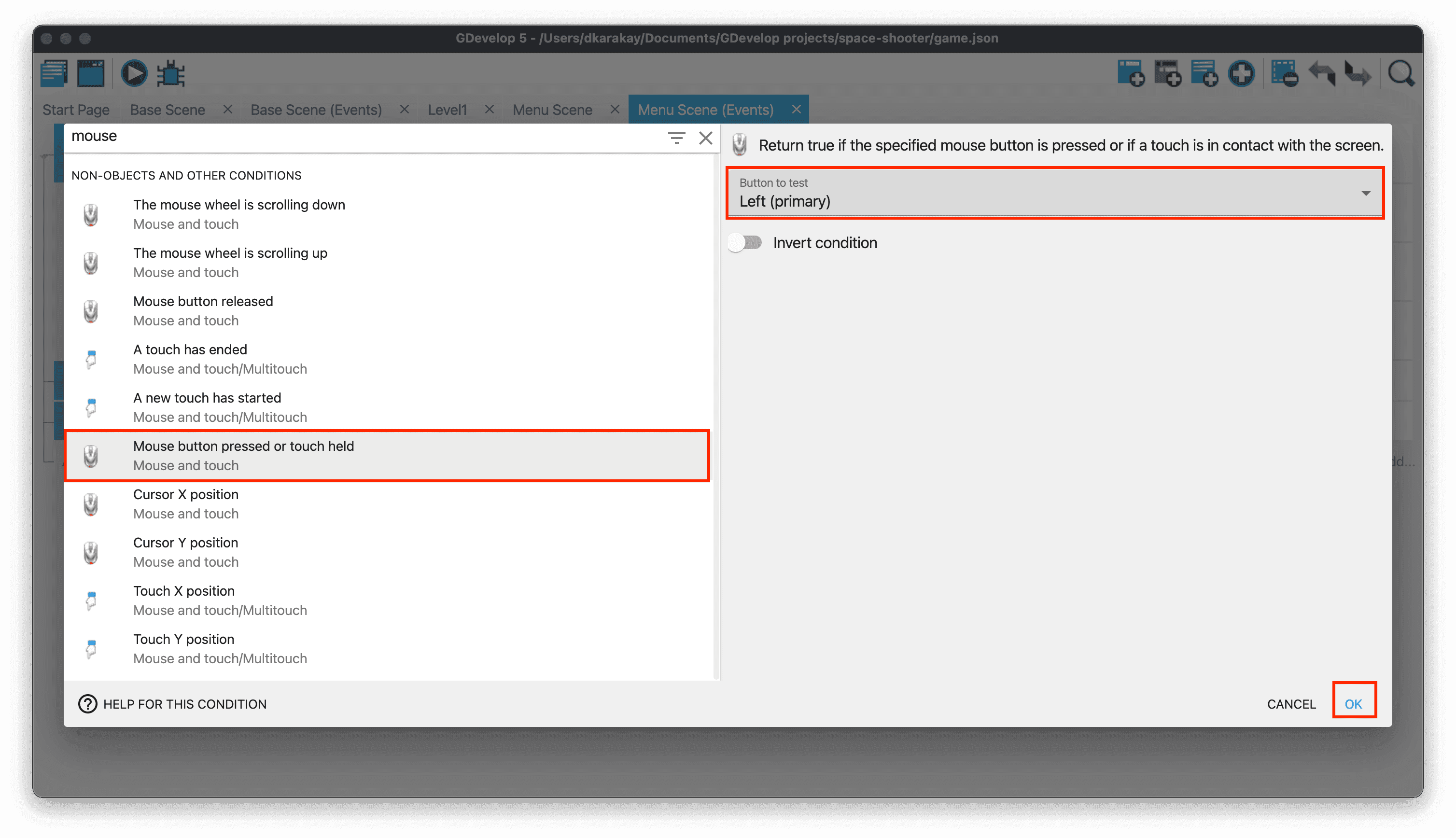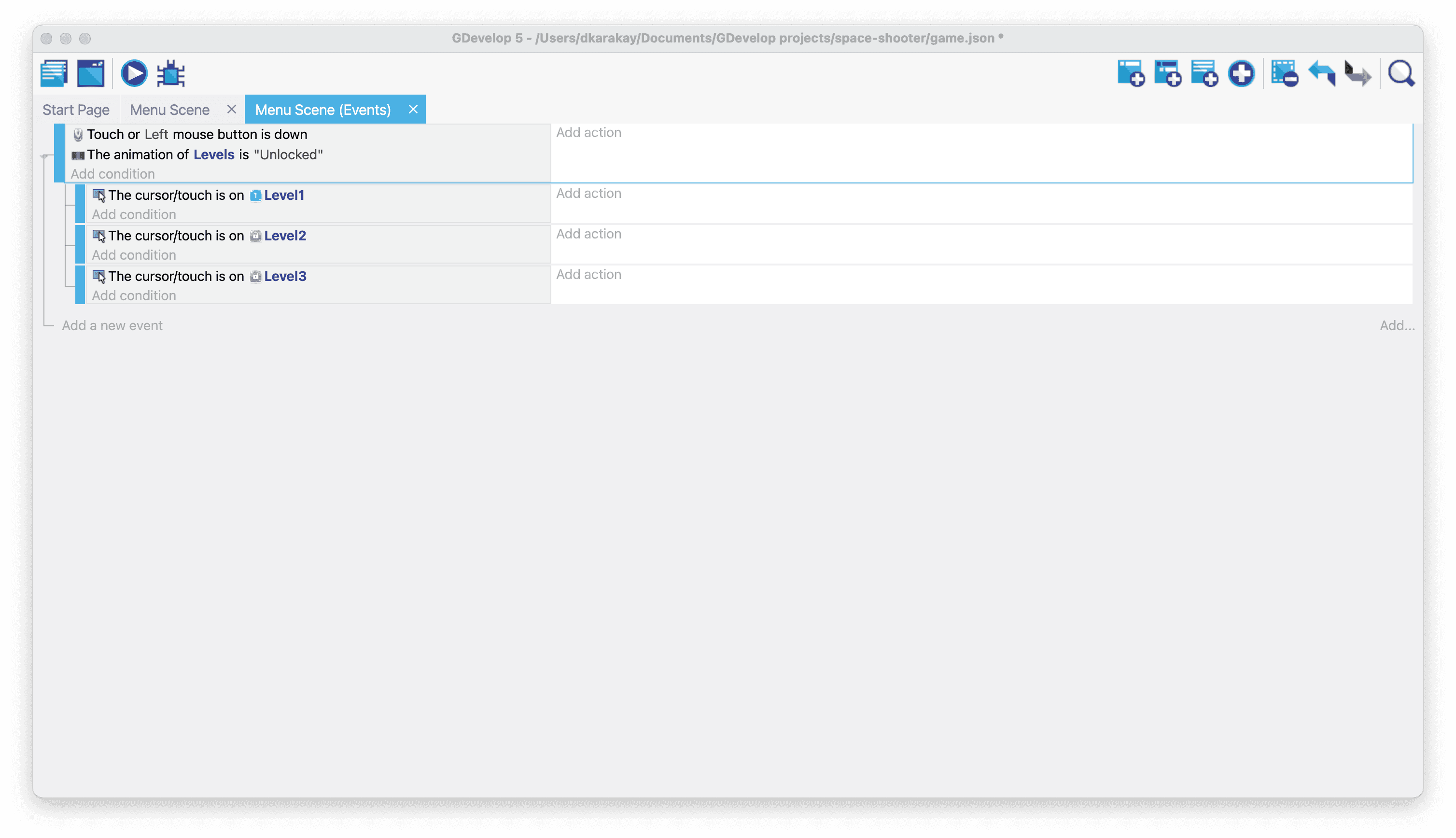 Open the events tab, and add a new event to check if the left button of the mouse has been pressed or not. We will use this to select level buttons.